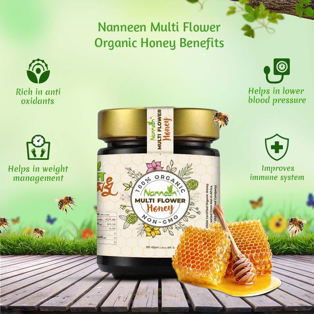 ন্যাননিন মাল্টি-ফ্লাওয়ার হানি USDA সার্টিফাইড অর্গানিক মাল্টি-ফ্লাওয়ার ওয়াইল্ড হানি, ১০০% নিরাপদ এবং খাঁটি মধু।